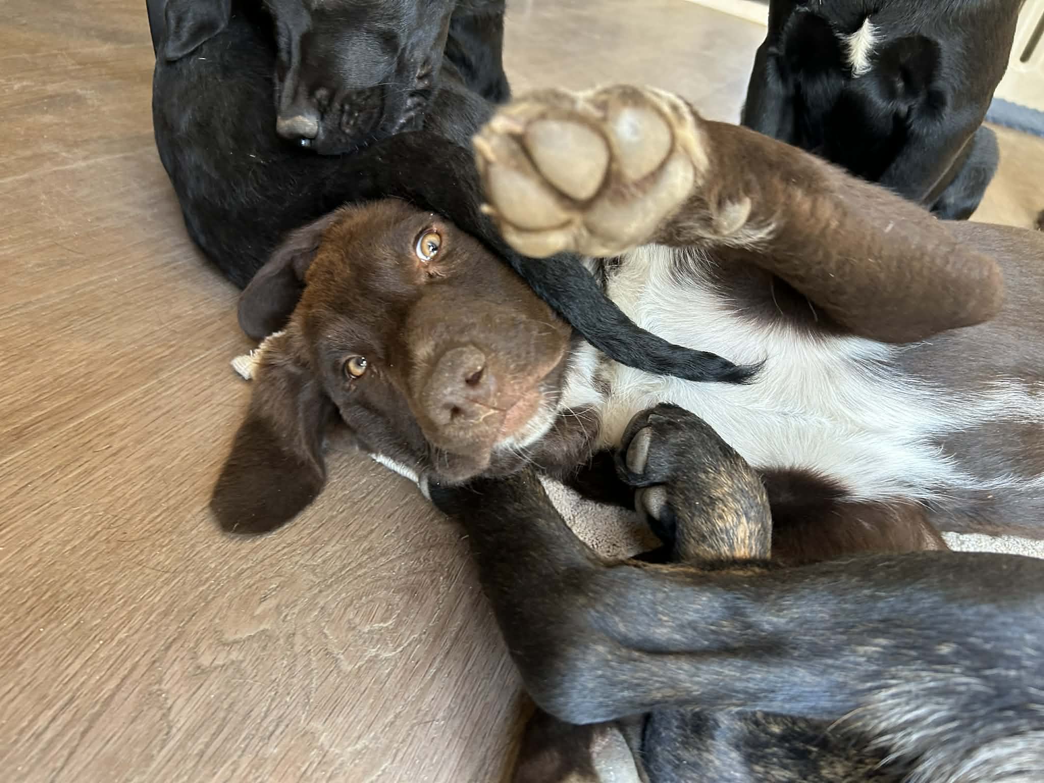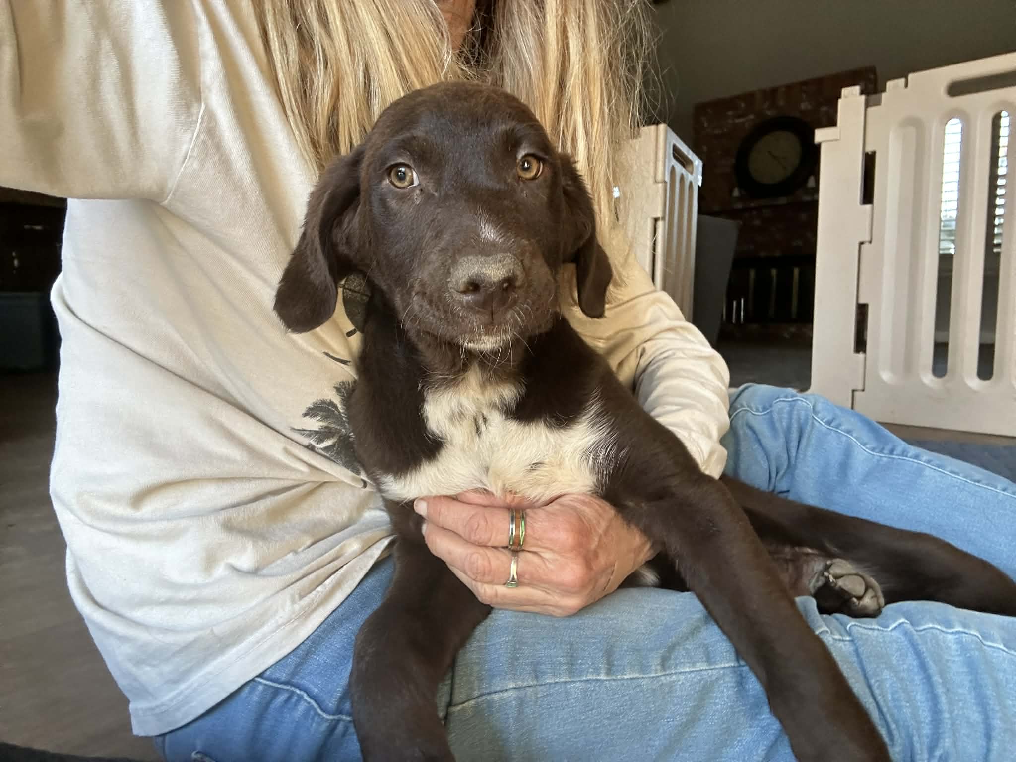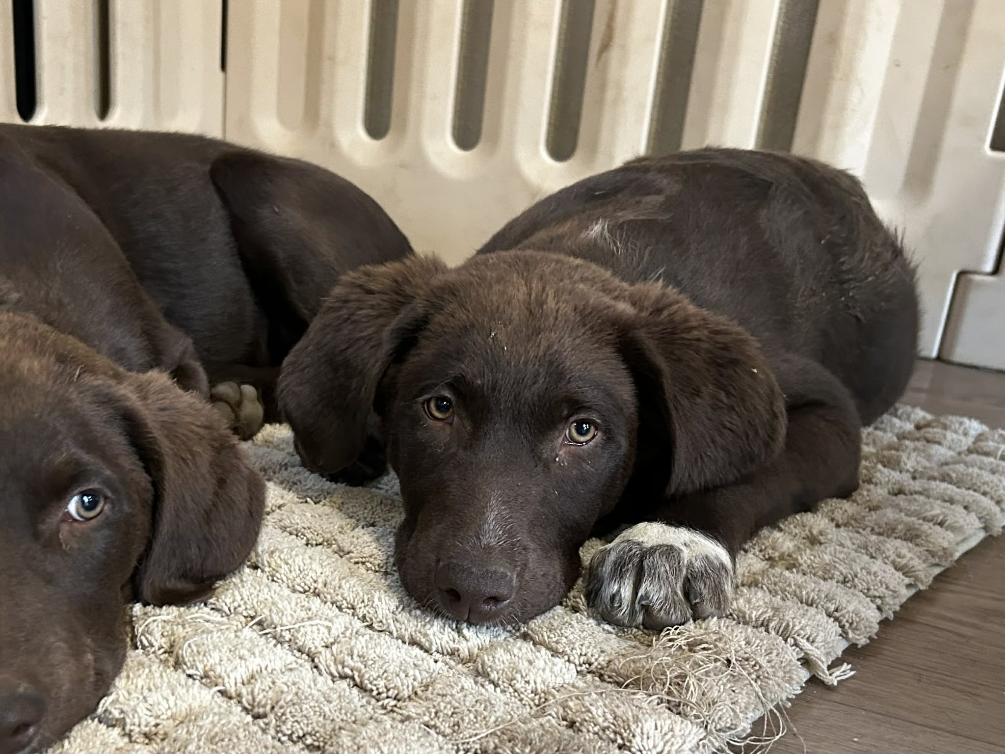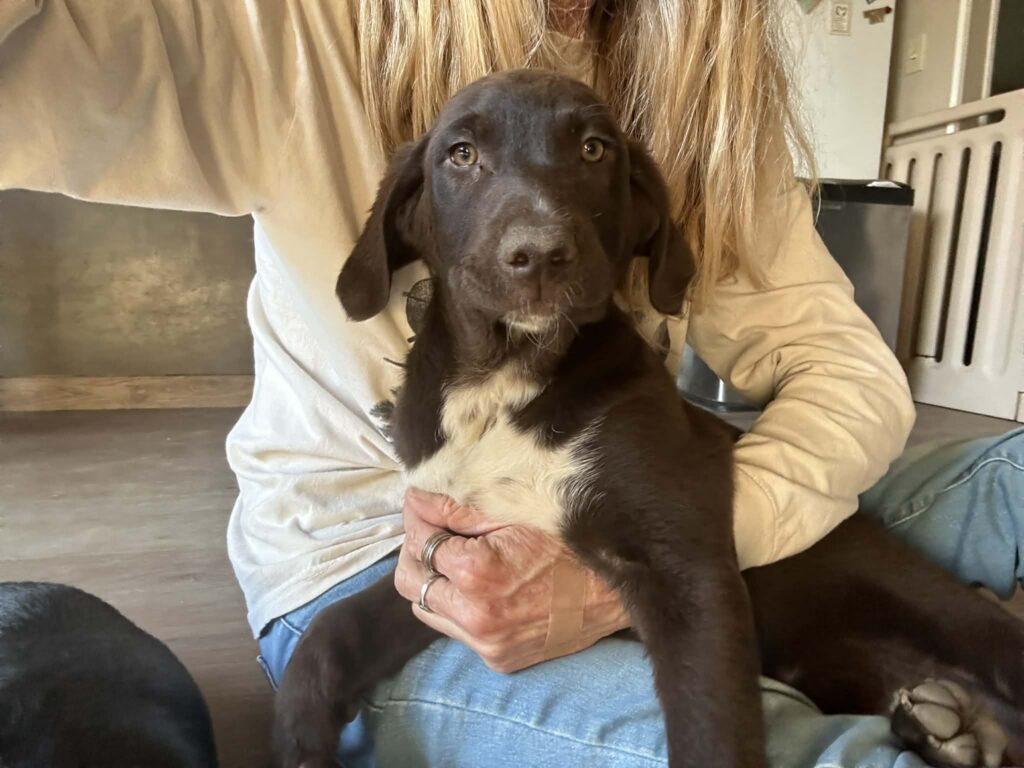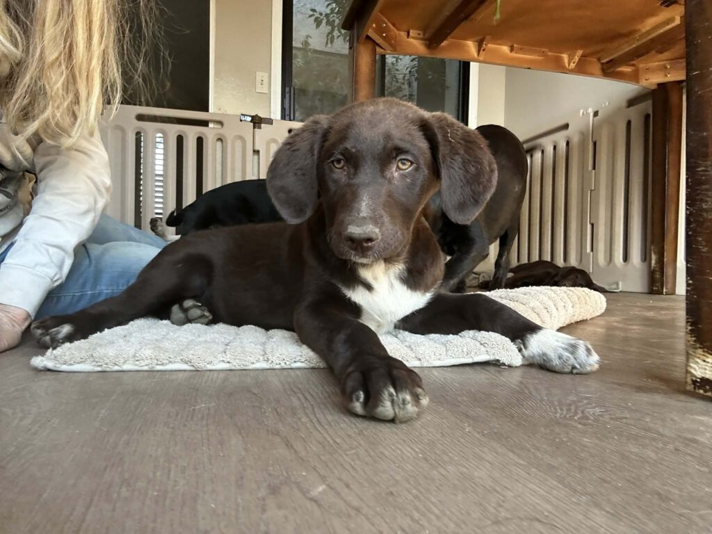 This handsome chocolate chunk already knows how to fetch, but his favorite game is still chasing his sisters and his foster friends around the yard. And if there’s water involved, he’s in absolute heaven!