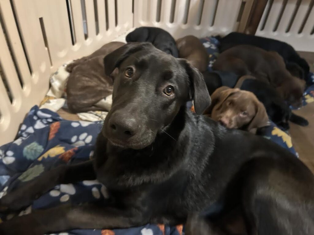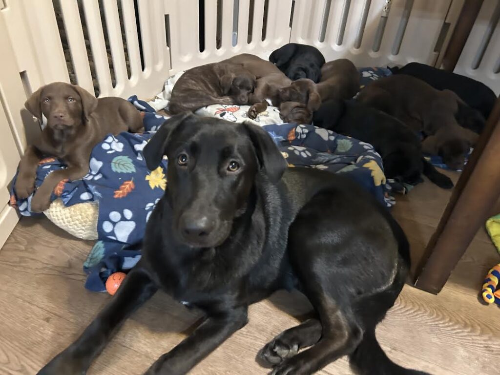 When I finally allowed him access, he was thrilled—and the puppies gained a surrogate mom in this sweet boy. Titus is the first to greet them in the morning and the last to leave them at night. Watching him “mother” these puppies has truly shown just how exceptional his temperament is.